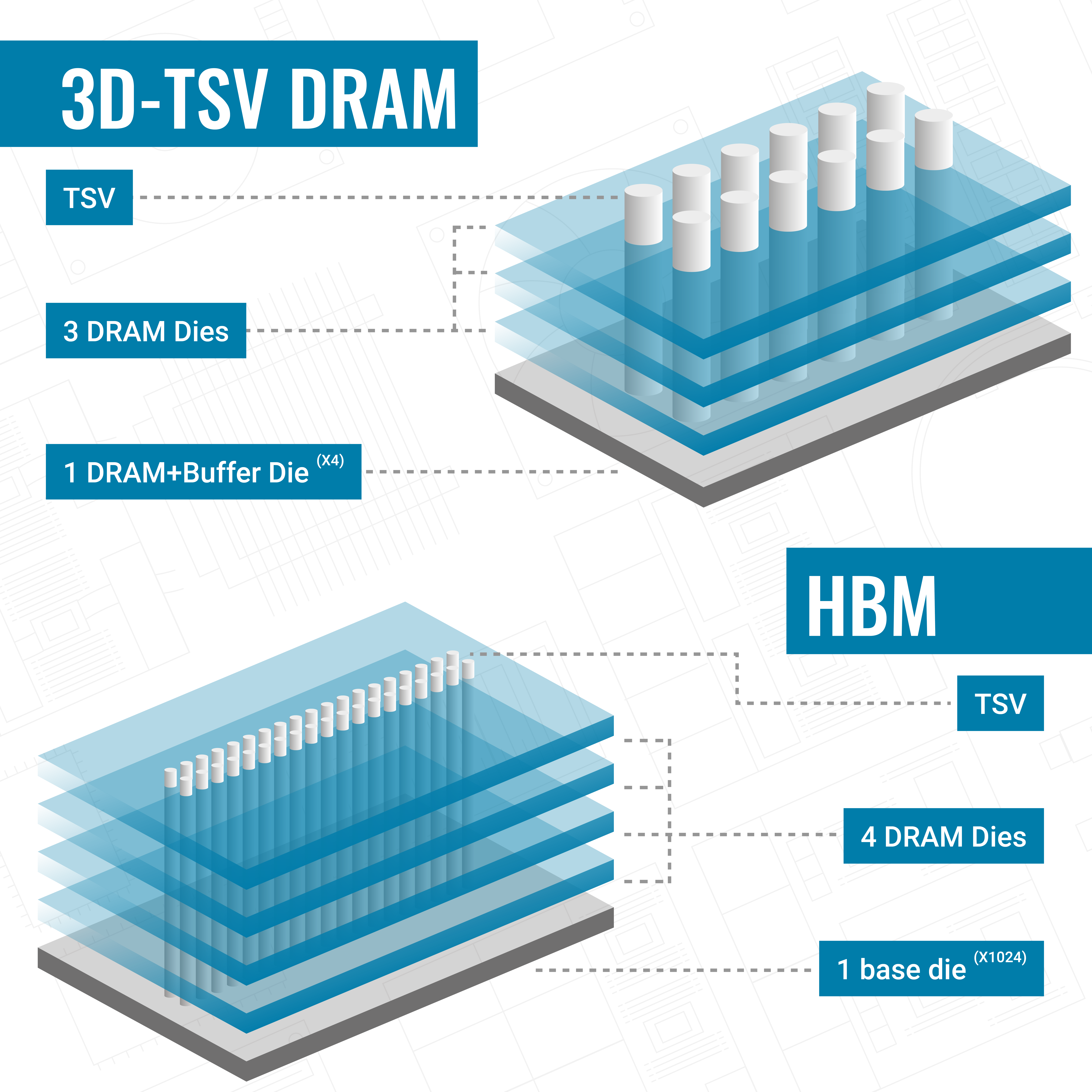 Semiconductor chips stacked on top of each other, connected by TSVs. - HBM: