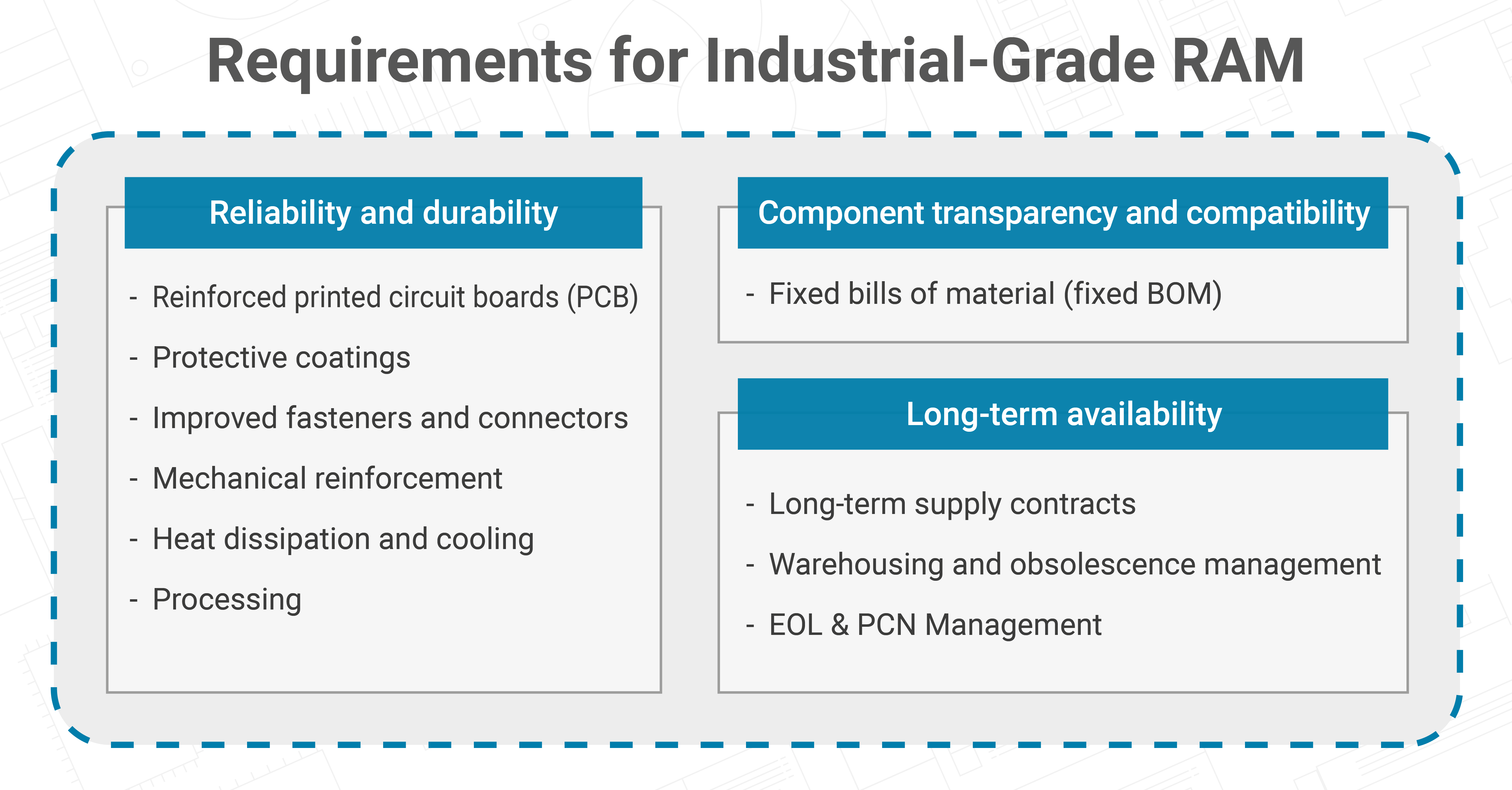 The term "industrial RAM" is not uniformly defined. However, memory for industrial needs often have special requirements for certain quality characteristics. These include those that improve 1) component transparency and compatibility, 2) reliability and longevity, and 3) long-term availability.