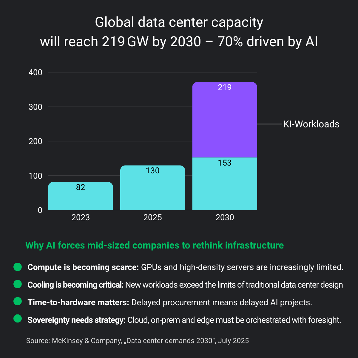 This applies to the hyperscaler model as well as to research, industry, and small and medium-sized businesses. McKinsey rightly refers to a "physical bottleneck to AI progress" – caused by energy shortages, space constraints, infrastructure delays, and the availability of specialized components.