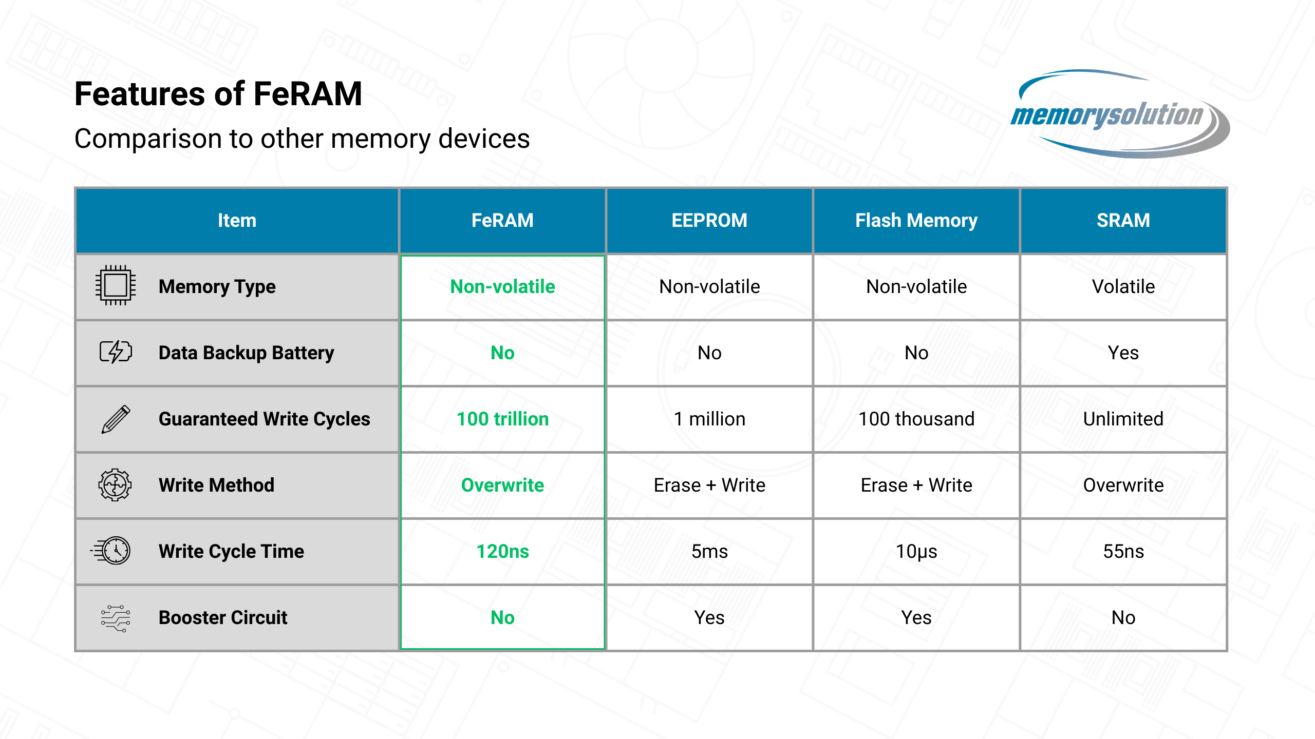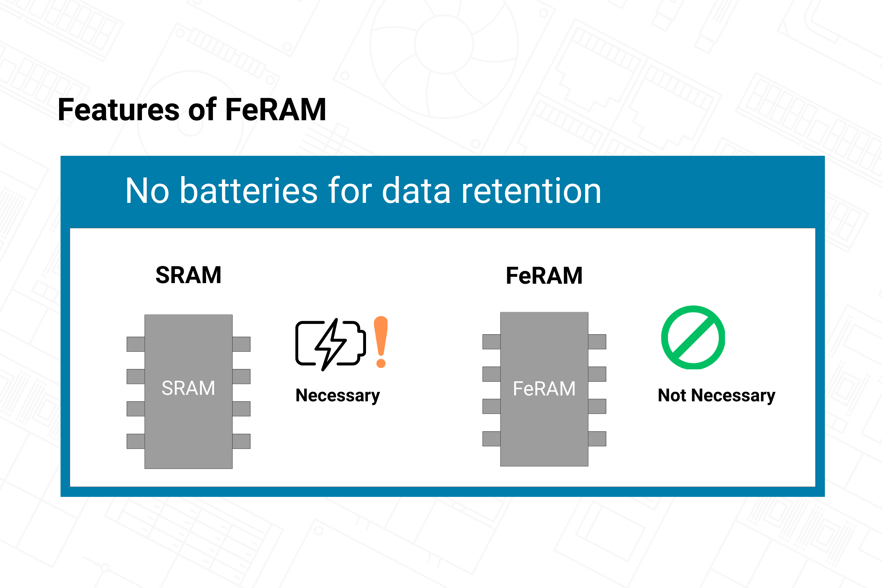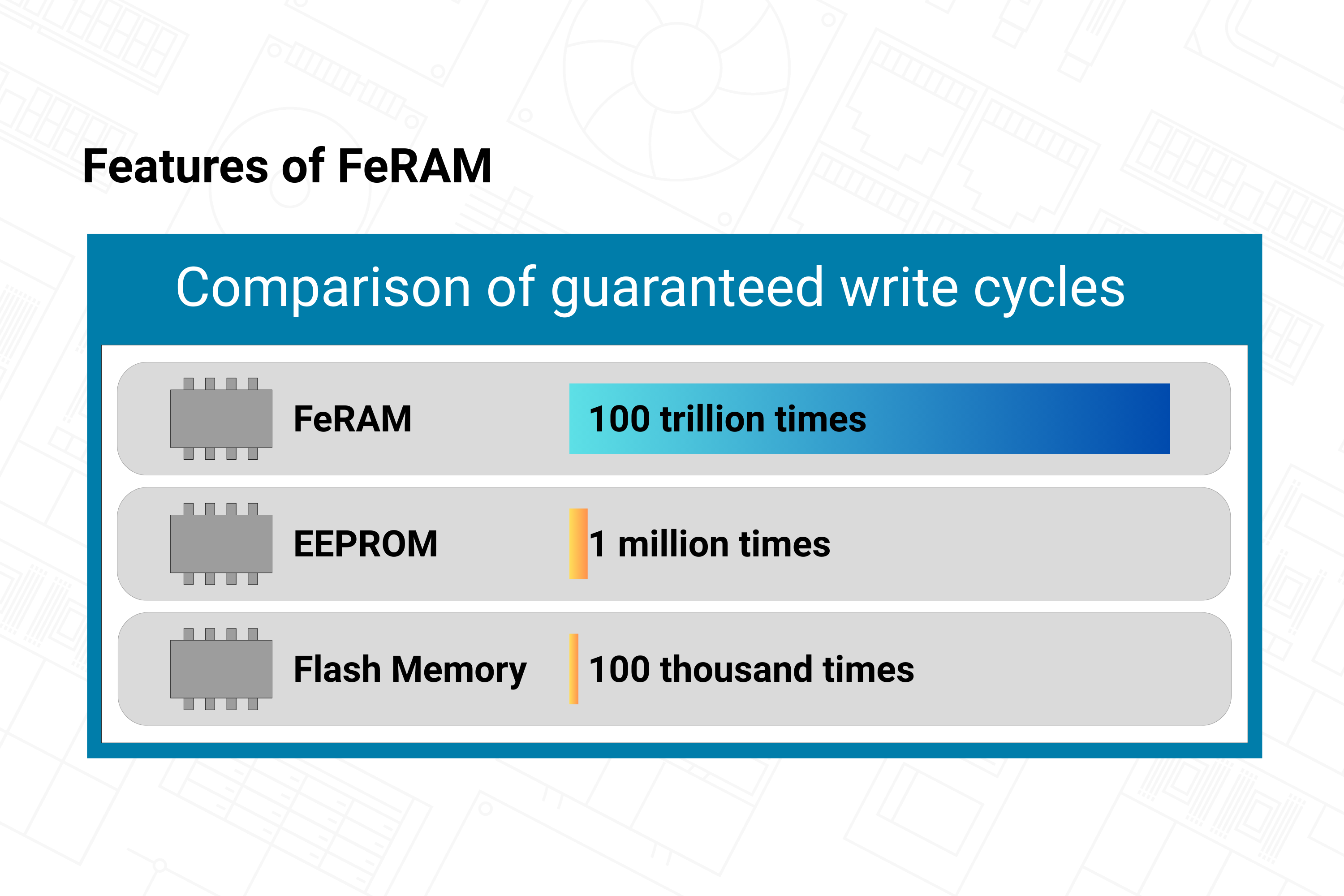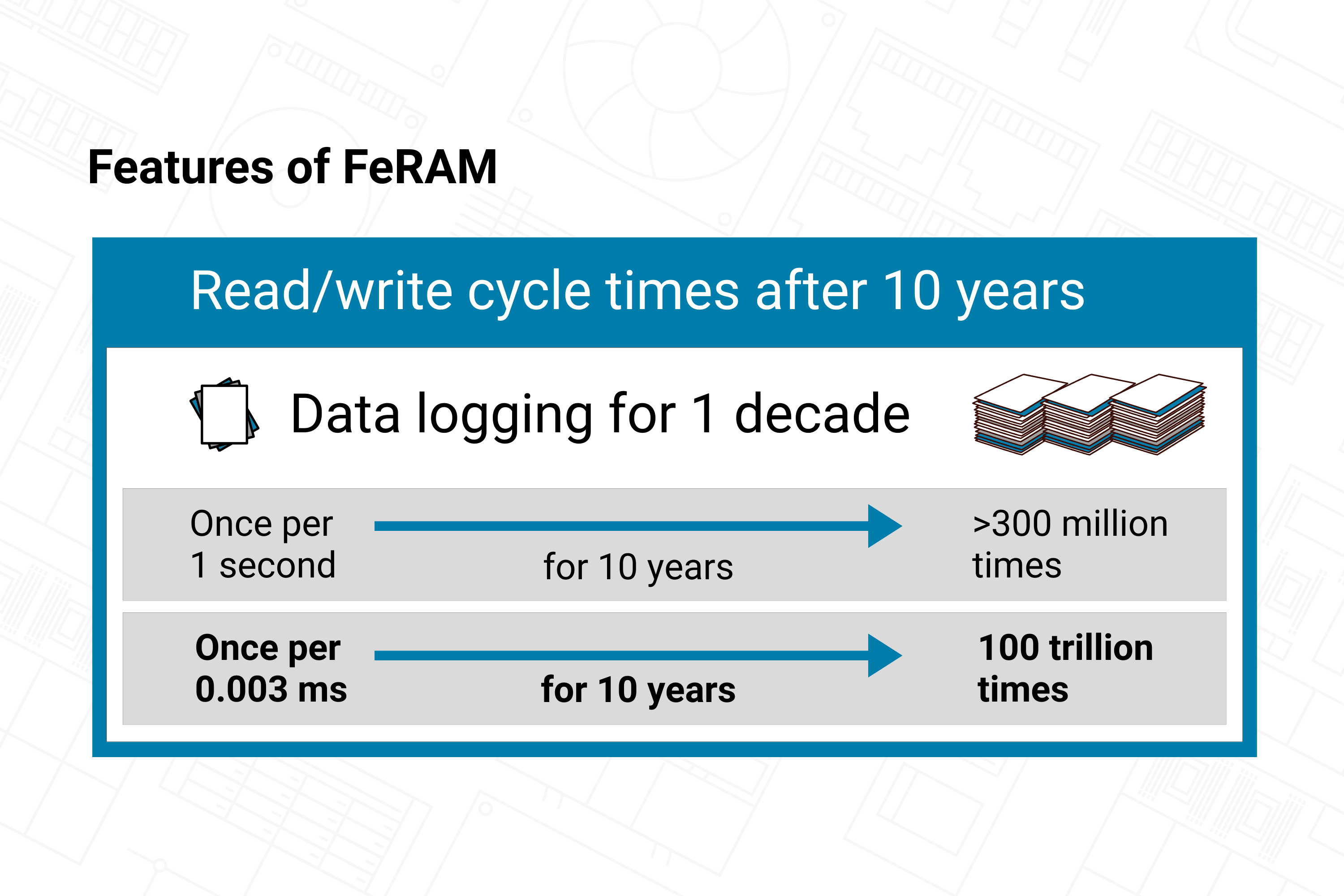 - High write cycle endurance: FeRAM can be written over many billions to trillions of cycles – a clear advantage over EEPROM or flash. Even with data storage every second over many years, no wear is to be expected.